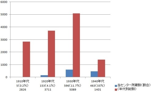 この6,728作品は、1910年から2015年までに公開された日本劇映画の総数37,233作品の18.1%にあたります。戦前期、特に無声映画作品の残存率は、欧米諸国のそれと比べてきわめて少ないです。当館所蔵の作品数で計算した場合、年代別に0.2%(1910年代)、4.1%(1920年代)、11.7%(1930年代)、33%(1940年代)となります。小津安二郎監督の戦前作品はその半分近くが失われ、溝口健二監督の場合は8割が失われています。世界的に見ても有数の映画大国であった戦前の日本映画は、残念ながらその大半の作品が(現在のところ)失われている状態です。