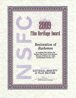 Digital Restoration of Rashomon received the Heritage Award from the National Society of Film Critics